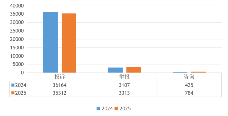 (一)接收数量。共接收群众各类诉求39409件,同比下降0.72%。其中:投诉35312件,占比89.60%;举报3313件,占比8.41%;咨询 784件,占比1.99%;截至目前,已办结38169件,办结率96.85%。