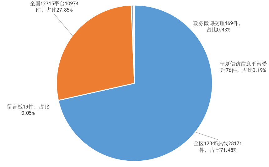 (二)接收渠道。全区12345热线交办28171件,占比71.48%;全国12315平台分派10974件,占比27.85%;政务微博受理169件,占比0.43%;宁夏信访信息平台受理76件,占比0.19%;各类留言板等渠道共19件,占比0.05%。