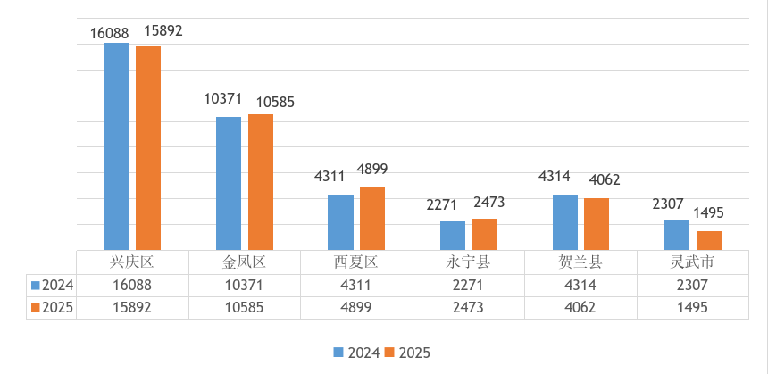 (三)区域分布情况。兴庆区15892件,金凤区10585件,西夏区4899件,永宁2473件,贺兰4062件,灵武1495件。