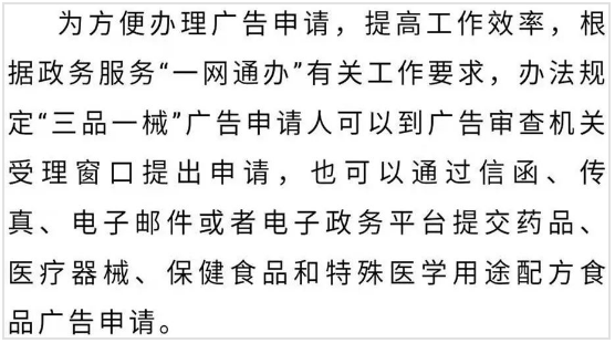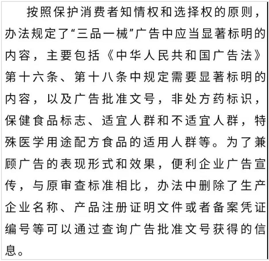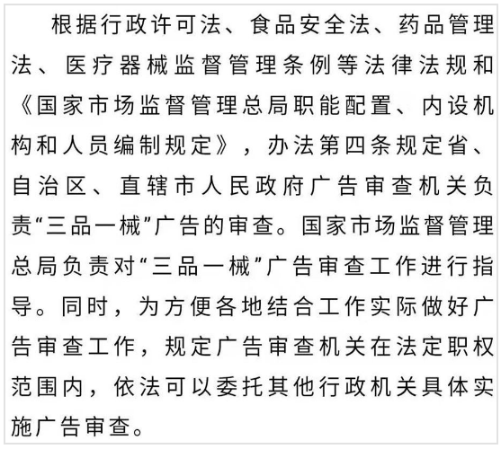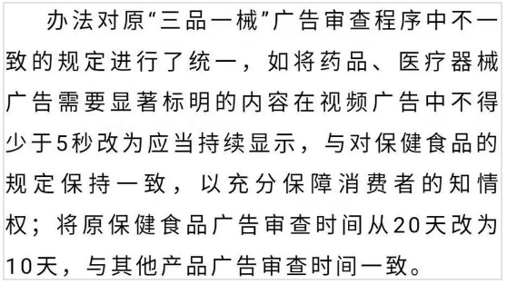 为贯彻落实“四个最严”要求,加强“三品一械”广告监督管理,规范广告审查工作,国家市场监督管理总局制定出台《药品、医疗器械、保健食品、特殊医学用途配方食品广告审查管理暂行办法》(2019年12月24日国家市场监督管理总局令第21号,以下简称“办法”),将于2020年3月1日起施行。
