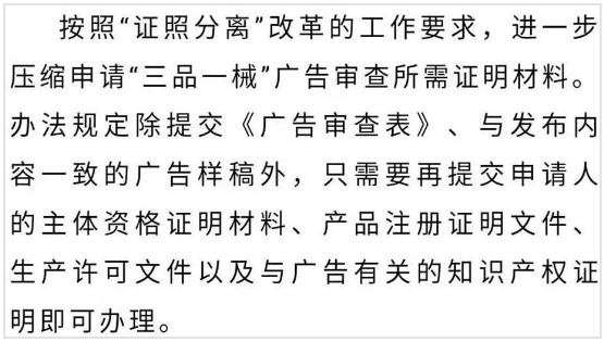 办法共三十四条,对“三品一械”广告审查的立法依据、适用范围、主管部门、内容标准、审查程序、发布要求、法律责任等作了系统全面的规定,本着“严”审查、“宽”程序的总体要求,力求做到内容标准严格、清晰,流程便捷、优化,主要包括以下内容: (一)明确“三品一械”广告审查管理机构职能与分工 (二)严格“三品一械”广告审查标准 (三)明确并精简“三品一械”广告应当显著标明的内容 (四)压缩申请证明材料 (五)延长“三品一械”广告批准文号有效期 (六)推行全流程网上办理 (七)统一“三品一械”广告审查程序等内容 (八)进一步明确“三品一械”广告公开时间、途径及内容